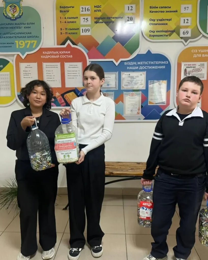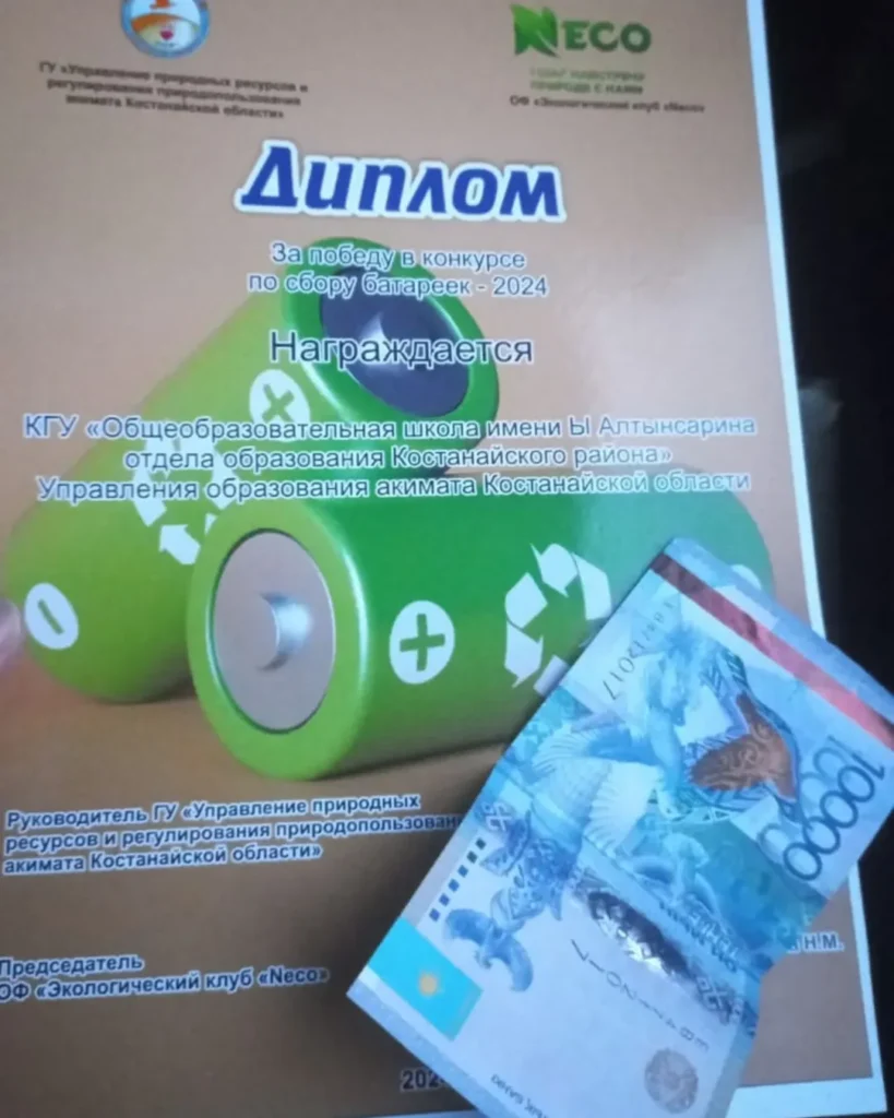 КММ оқушылары. ОШ аты Ы.Алтынсарин «Neco» экологиялық клубы мен Қостанай облысы әкімдігінің Табиғи ресурстар және табиғатты пайдалану басқармасы ұйымдастырған батареяларды жинауға қатысты. Батареяларды жинауға белсенді қатысуымыздың нәтижесінде мектеп 1-орынға ие болды. Бұл жетістік біздің қоршаған ортаға деген қамқорлығымызды және өскелең ұрпақ үшін тәрбиенің маңыздылығын көрсетеді. Қоршаған ортаны жақсартуға ең аз үлес қосудың өзі үлкен пайда әкелетініне сенімдімін! Бірге біз бұл әлемді жақсартамыз!