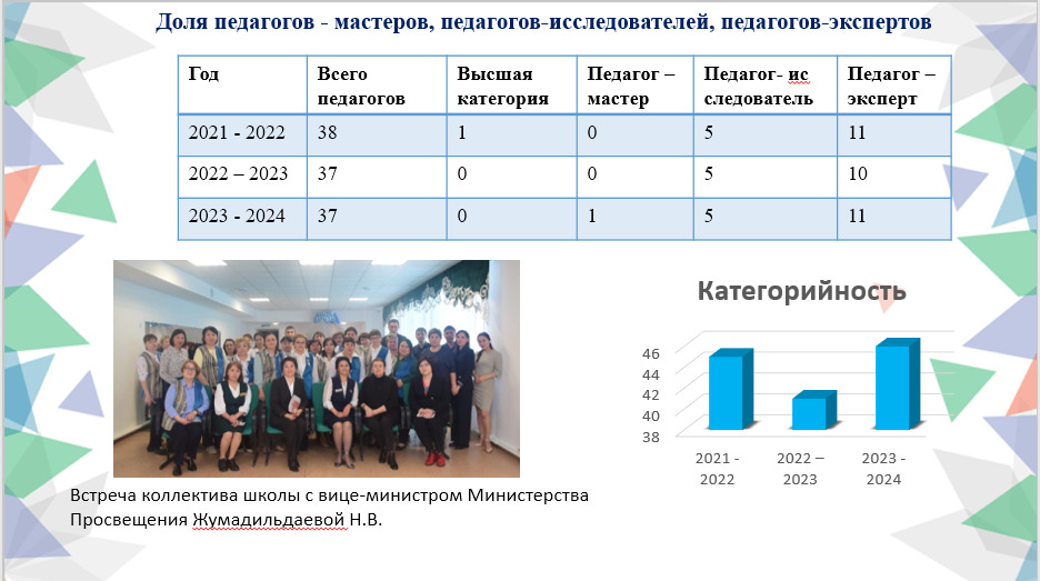 Школа работает с 1977 г. На данный момент педагогический коллектив состоит из 45 педагогов, из них 1 педагог –мастер, 5 педагогов-исследователей, 10 педагогов-экспертов, 5 педагогов имеют академическую степень магистра. В школе активно работает дебатный клуб «Пікір» в рамках проекта «Ұшқыр ой алаңы». По спецпроекту «Читающая школа» регулярно проводятся различные мероприятия по популяризации чтения, создан «Читающий уголок». Ко Дню Независимости запланировано открытие именного кабинета учителя казахского языка Айсариновой М.Т. Школа работает по программе развития «Школа возможностей» как STARTUP будущей профессии», в состав которой входит школьное самоуправление совместно с педагогами и студентами ВУЗов и колледжей. Одними из ярких мероприятий, которые были проведены в рамках данной программы, являются областной «ЭкоFEST» «Коммунарская ночь», посвященная дню национальной валюты, «КВН», зимняя военно-спортивная игра «Зарница». На базе школы открыты филиалы районной детской музыкальной школы, областной детской юношеской спортивной школы, «Арт-спорта». Созданы все условия для работы молодых специалистов. На протяжении последних трех лет учащиеся школы занимают призовые места в областных и республиканских конкурсах и соревнованиях.